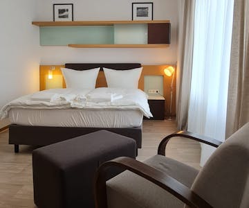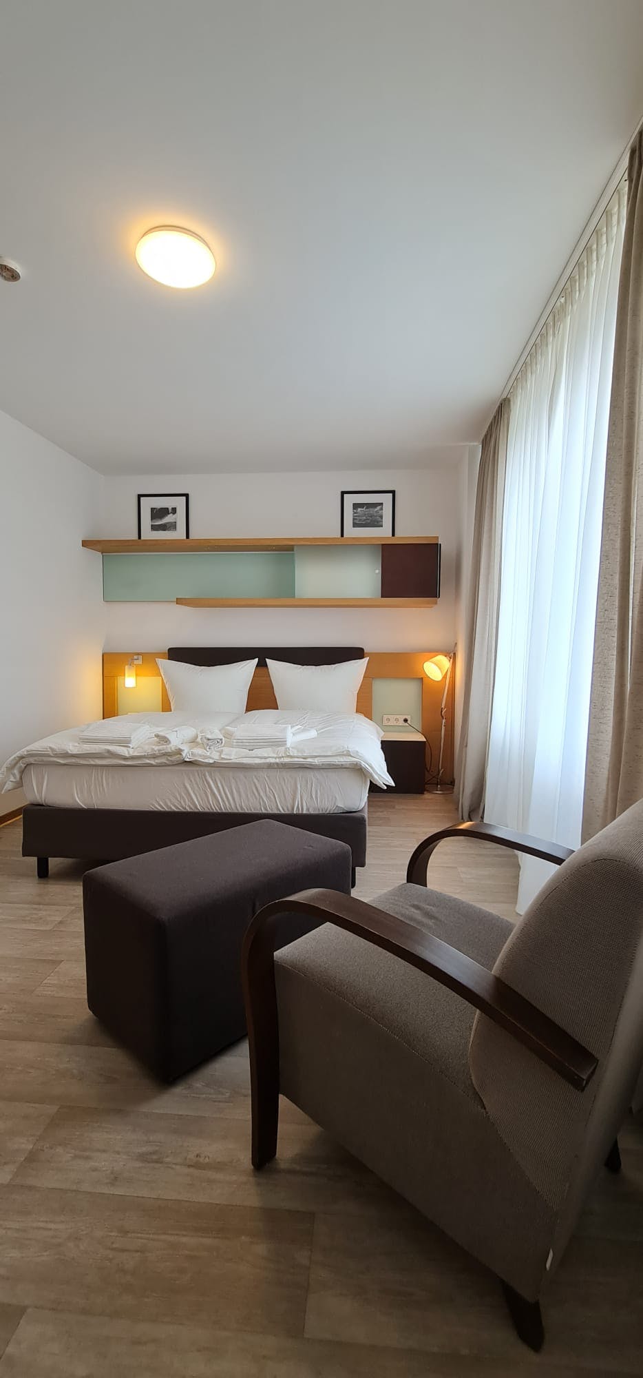 Eine Flasche Wasser, kostenlose Kaffeepads sowie eine Teeauswahl liegen für den Gast bereit, Am modernen Foodji-Essensautomaten sind frische regionale warme und kalte Speisen erhältlich.